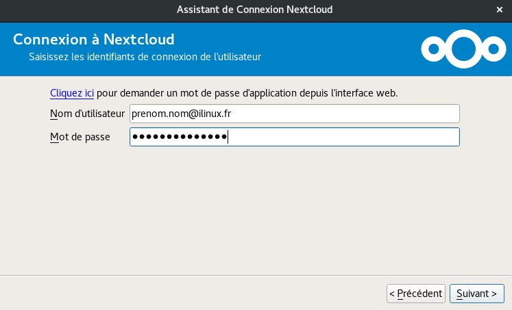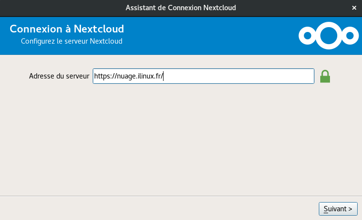 - Renseignez l'adresse du serveur nuage ilinux, https://nuage.ilinux.fr,